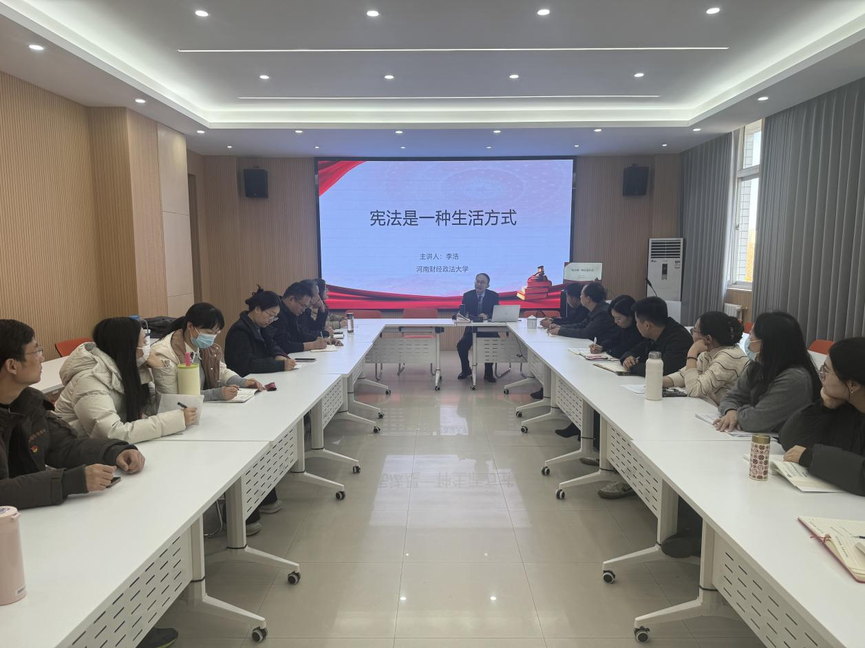 李浩以“宪法是一种生活方式”为主题,从宪法的过去、现在和未来,讲述了宪法的重要性。他指出今年12月4日,是我国第十二个国家宪法日。宪法是国家的根本法,是治国安邦的总章程,是党和人民意志的集中体现。党的十八大以来,以习近平同志为核心的党中央高度重视宪法在治国理政中的重要地位和作用,丰富和发展了中国特色社会主义宪法理论和宪法实践,推动我国宪法制度建设和宪法实施取得历史性成就。他号召老师们深入学习宣传贯彻习近平法治思想,推动宪法深入人心,为推进中国式现代化凝聚法治力量。